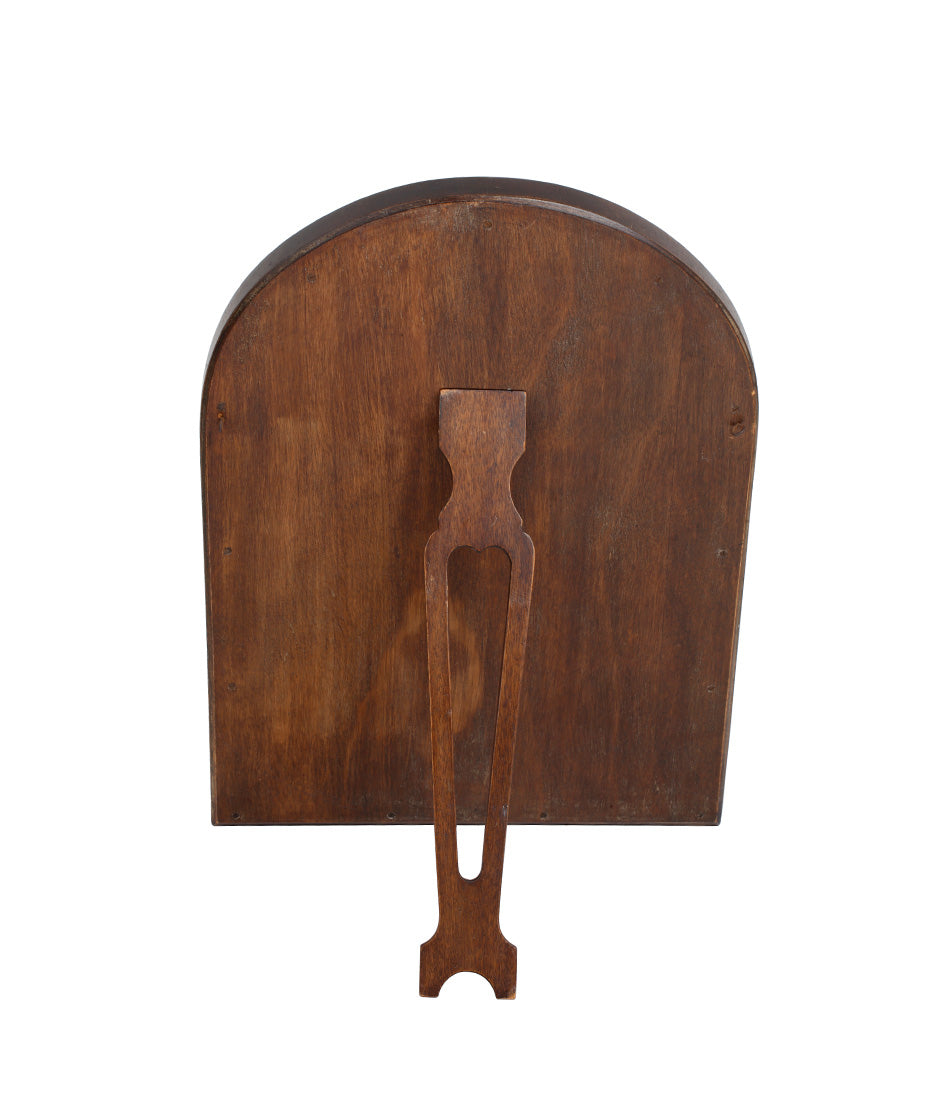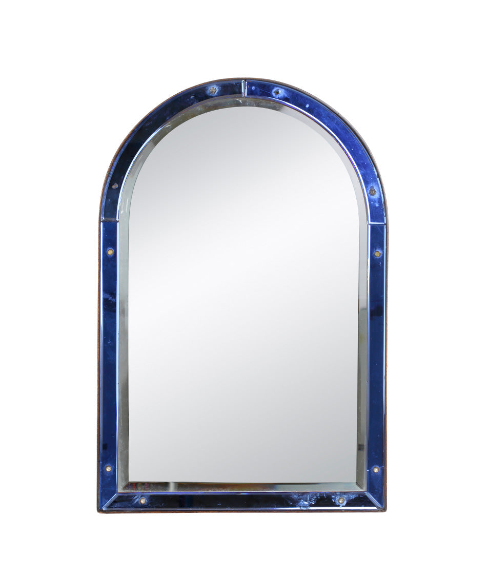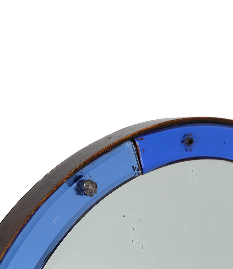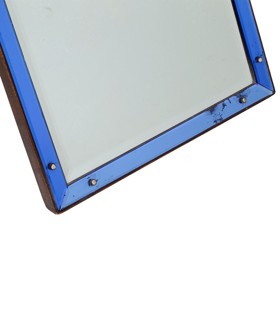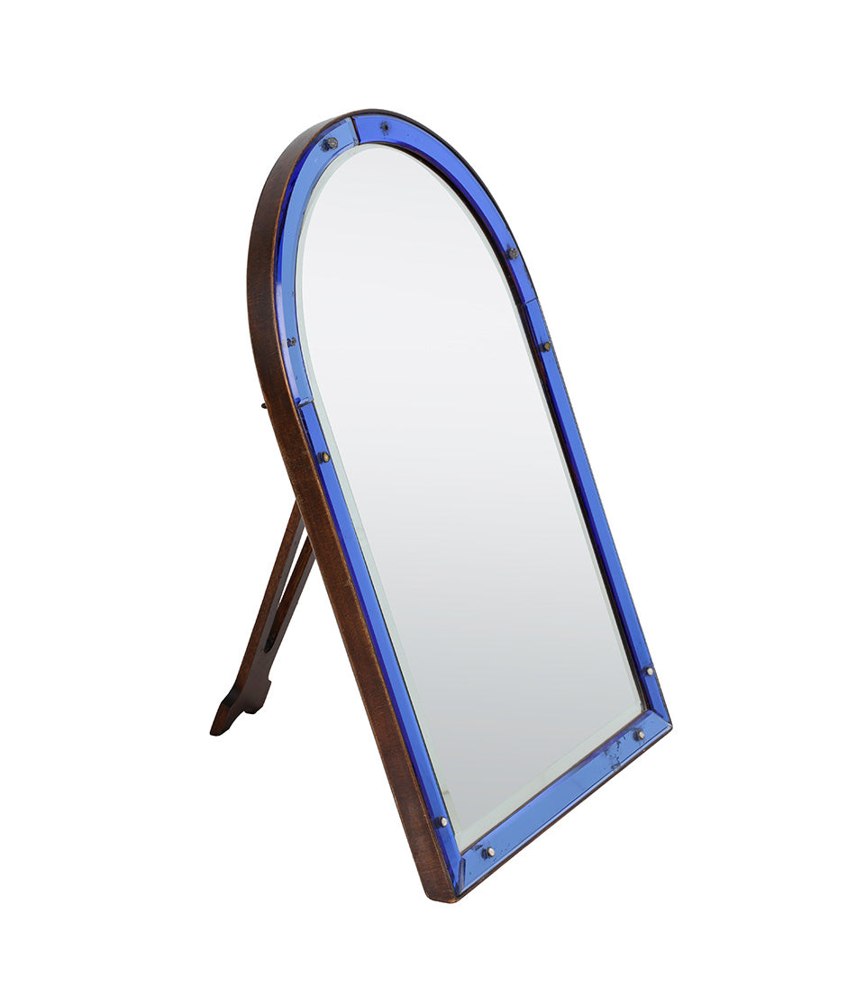 An elegant 1920s easel mirror. A striking cobalt blue border glass frame surrounds a large shaped bevelled plate. Some rosettes missing.