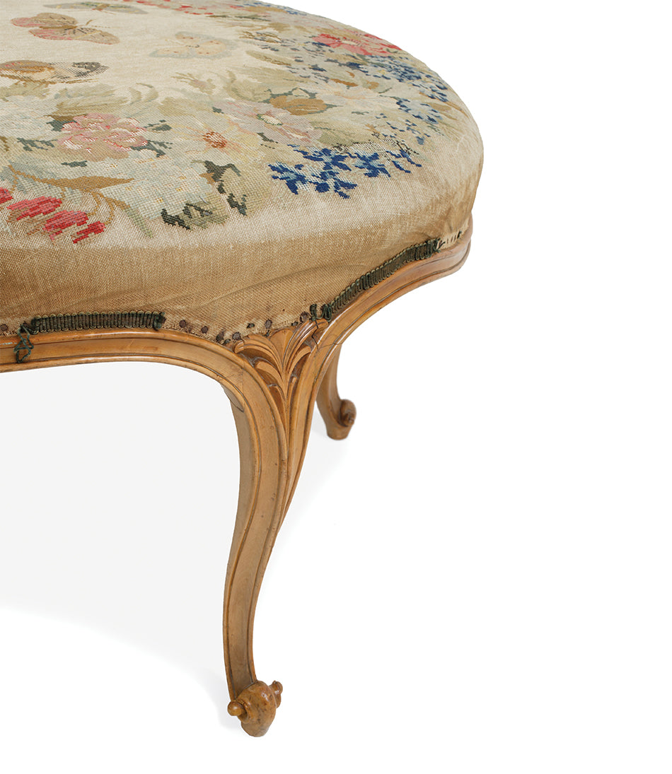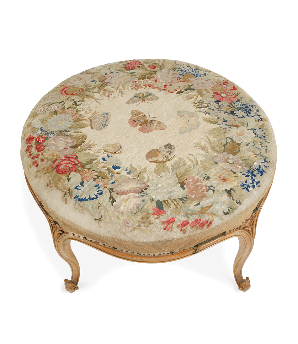 A 19th Century circular satin birch stool with original needlepoint upholstery with butterflies and flowers on four elegantly carved legs terminating in a stylised ram’s head.
