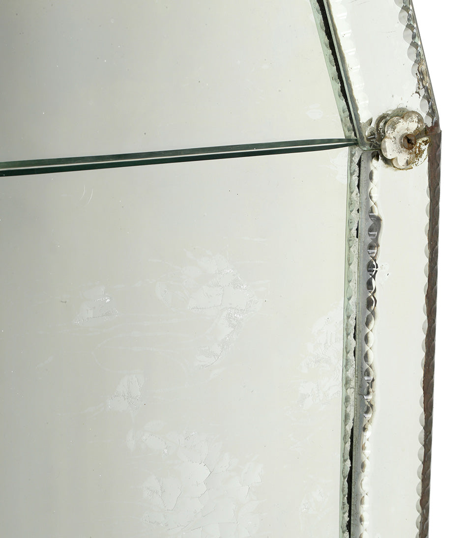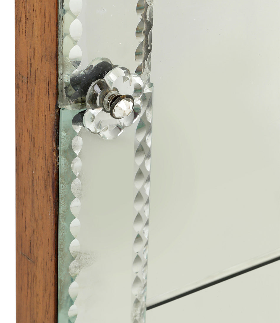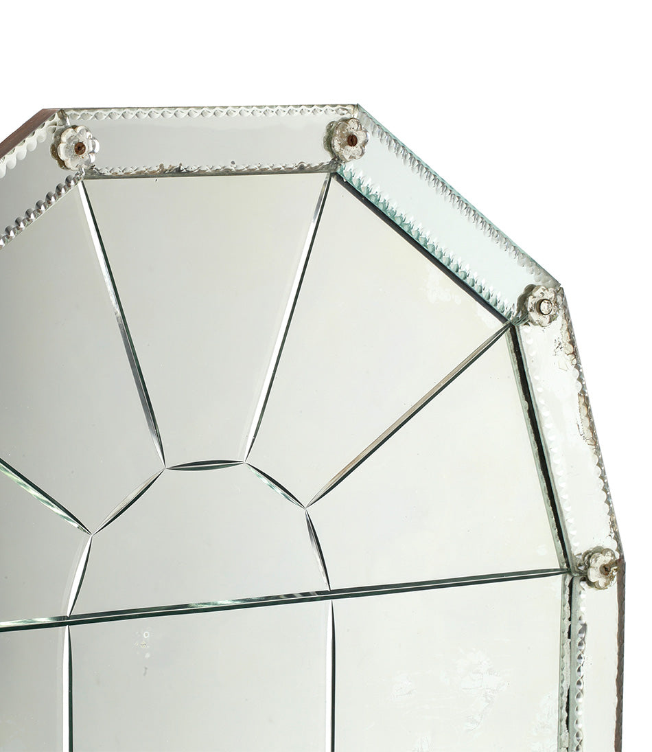 An unusual English Art Deco segmented mirror with a dome top. The architecturally shaped bevelled plates with a decorative outer rim with faceted floral jewel screws.