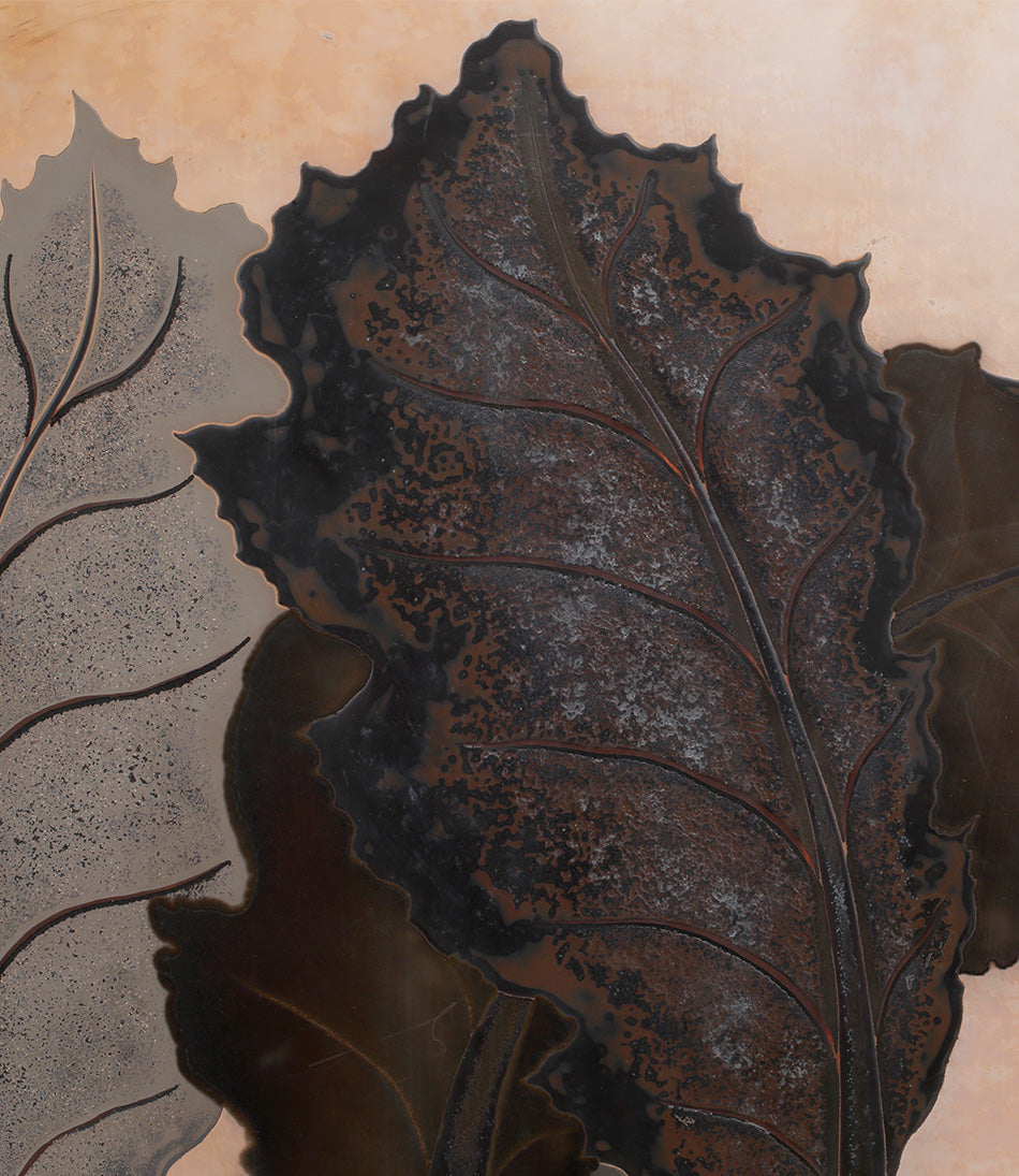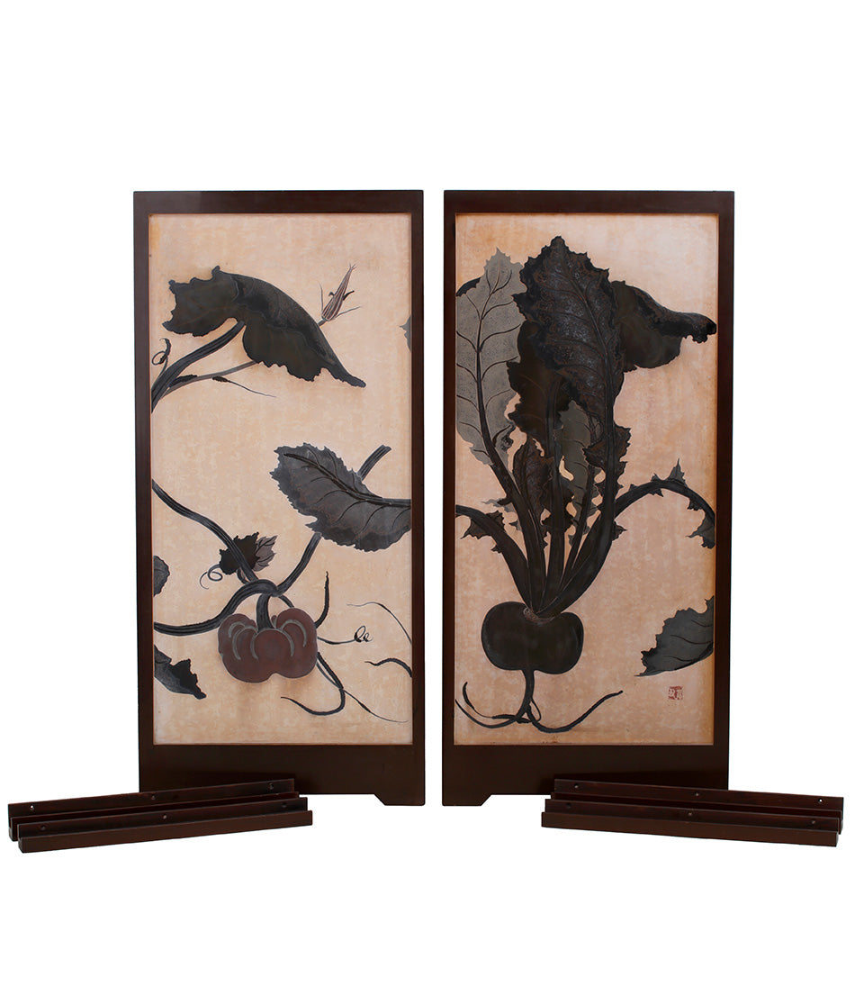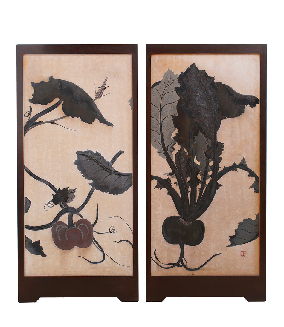 This piece consists of two wood framed panels, each decorated with a design in coloured lacquer over an off-white lacquer background. The left panel has a striking depiction of a kabocha (pumpkin), while the right panel has a bold kabu (turnip) design. The panels are signed with a red two-character seal reading “Shogo” 省吾. The reverse side of each panel is finished in brown lacquer and is decorated with three nasubi (aubergines) rendered in off-white lacquer. An inscription of the back reads: Koki nisenryoppyakuyonen Daitoasenka Shogo kinsaku 皇紀二千六百四年大東亜戦下 省吾謹作 (Respectfully made by Shogo in 1944 during the Great East Asian War).