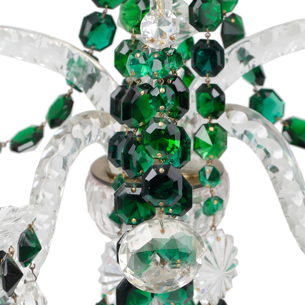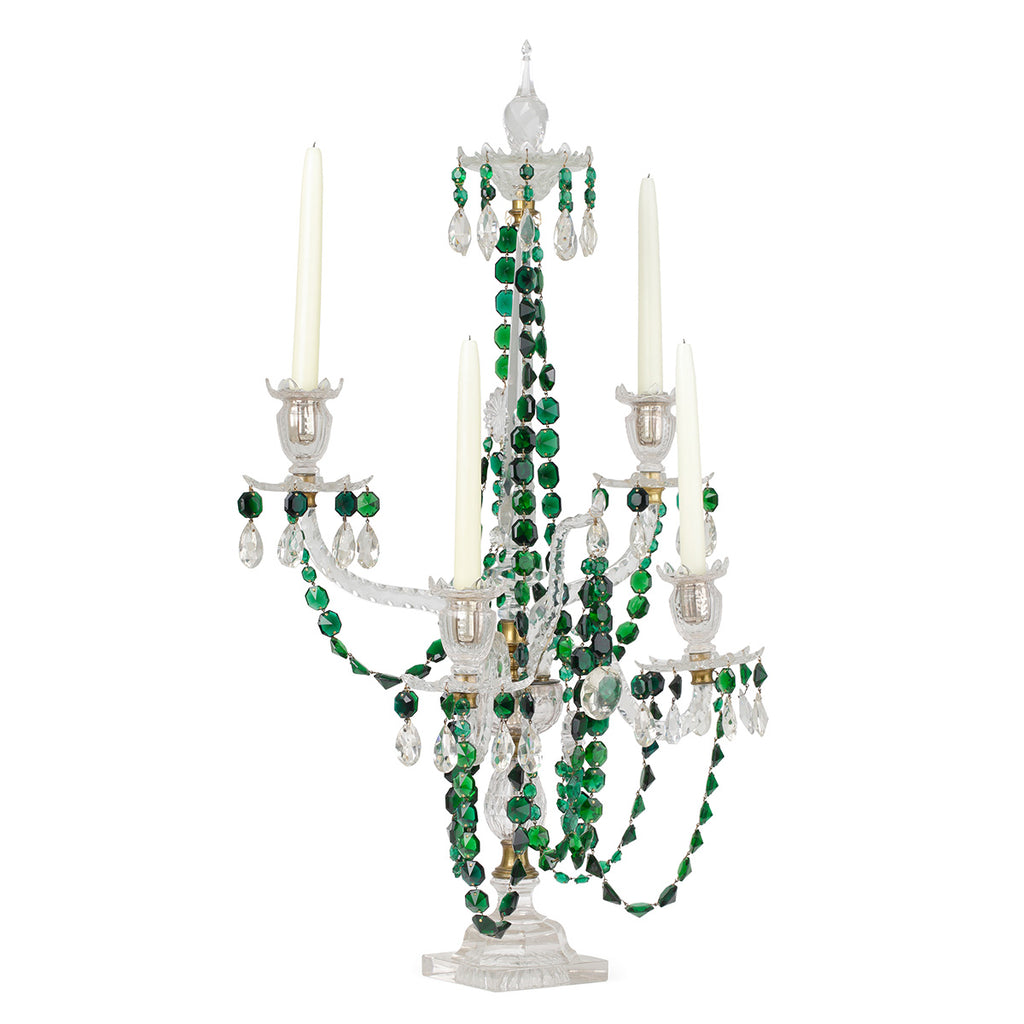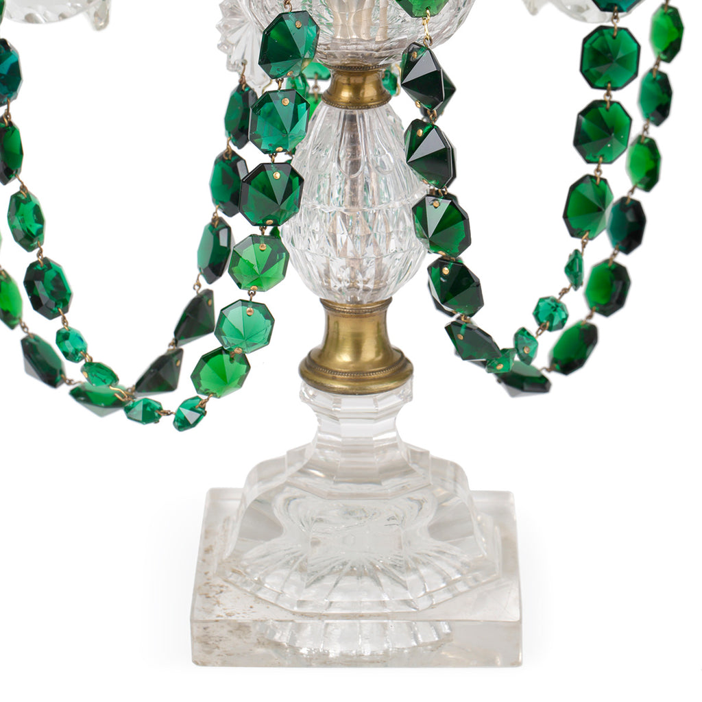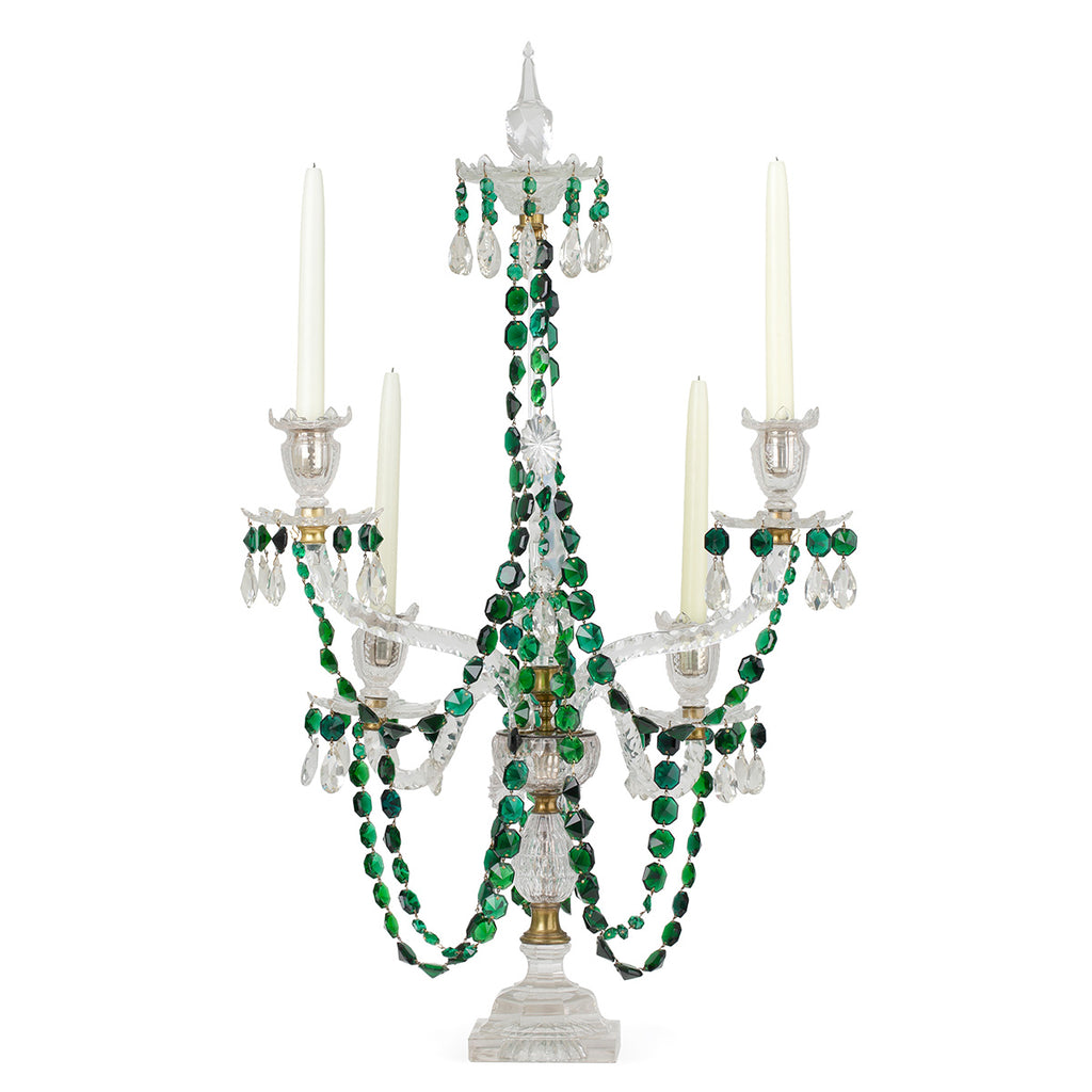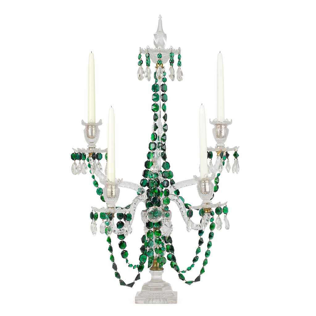 A boldly scaled, elegant four-light candelabrum. Crafted from clear cut glass and adorned with draped garlands of faceted rich green cut glass. Four petal-cut glass candle pans with teardrop pendants taper symmetrically around a striking central stem.