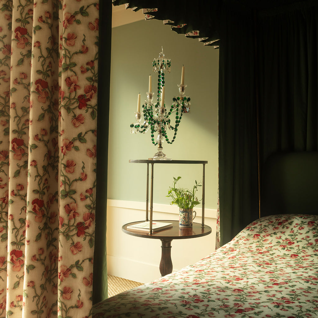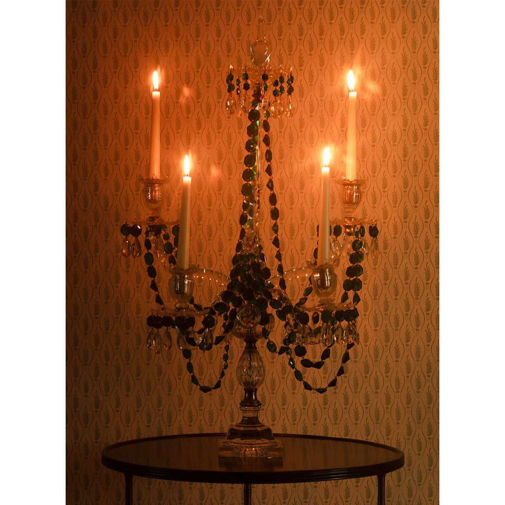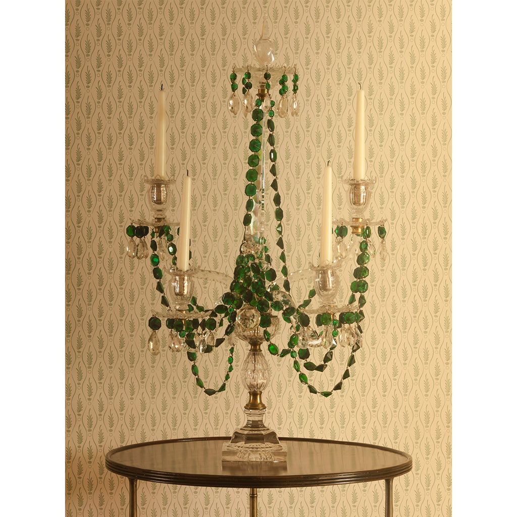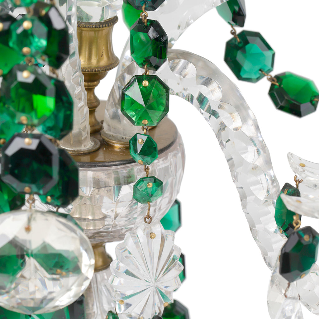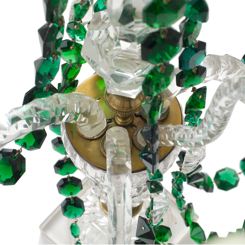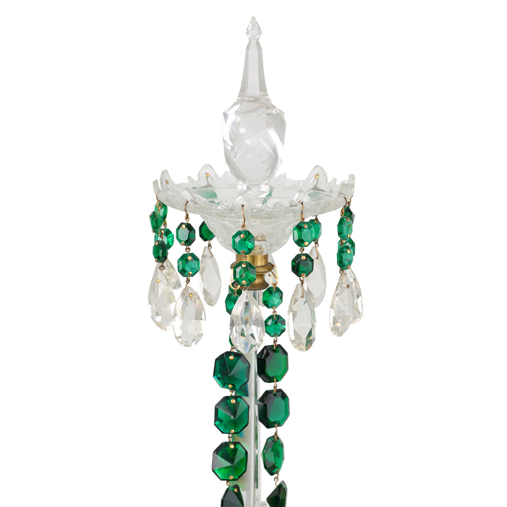 A boldly scaled, elegant four-light candelabrum. Crafted from clear cut glass and adorned with draped garlands of faceted rich green cut glass. Four petal-cut glass candle pans with teardrop pendants taper symmetrically around a striking central stem.