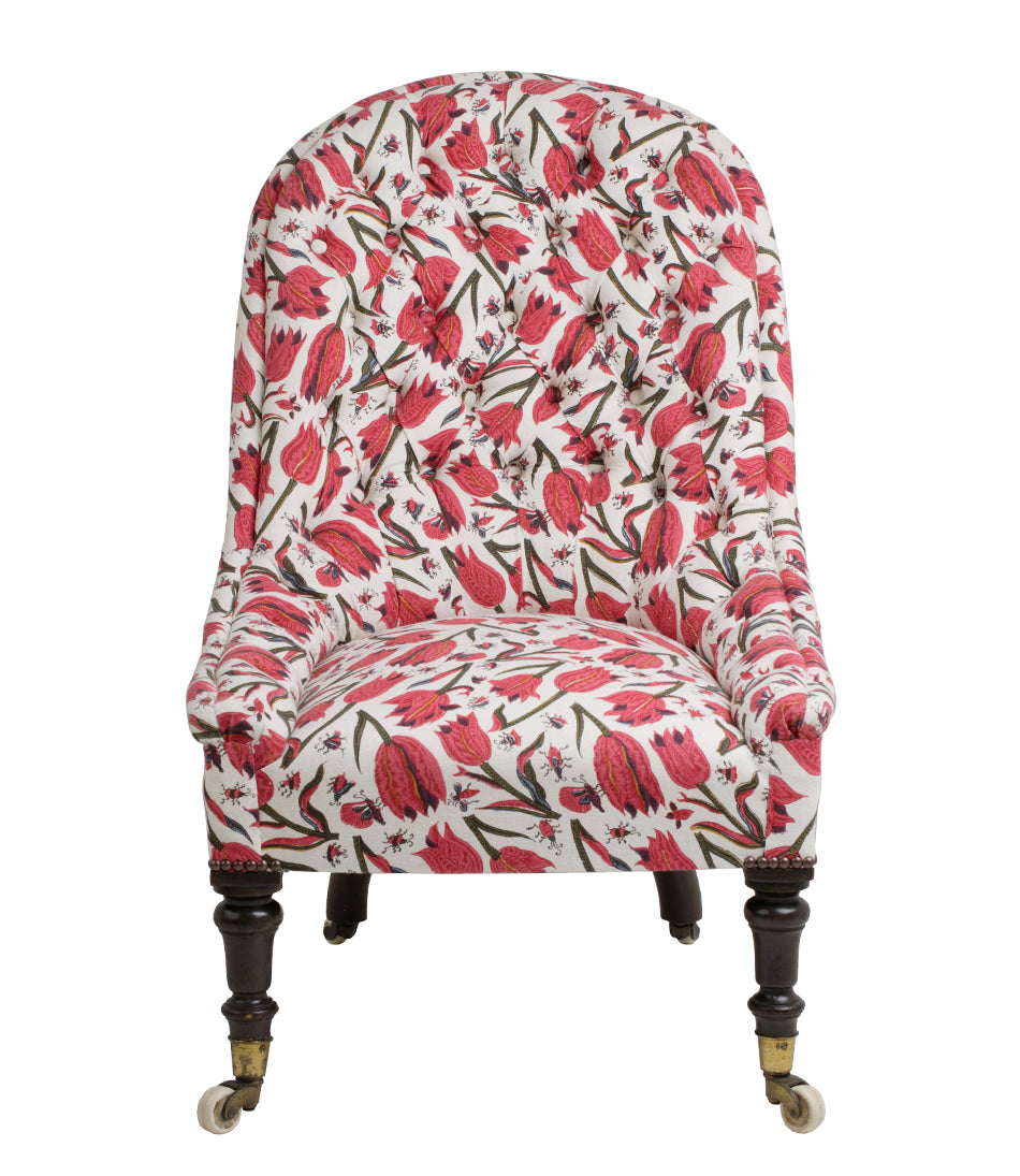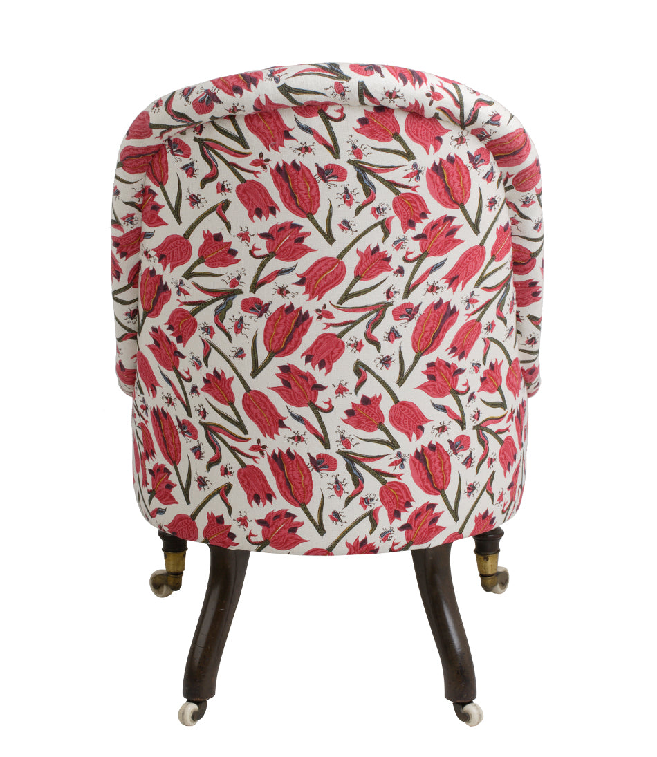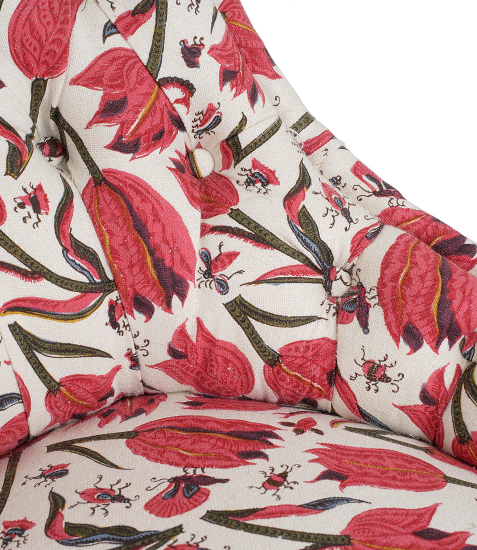 With turned mahogany legs. Upholstered in Soane’s Tulips and Butterflies - Original - Mutka Silk.