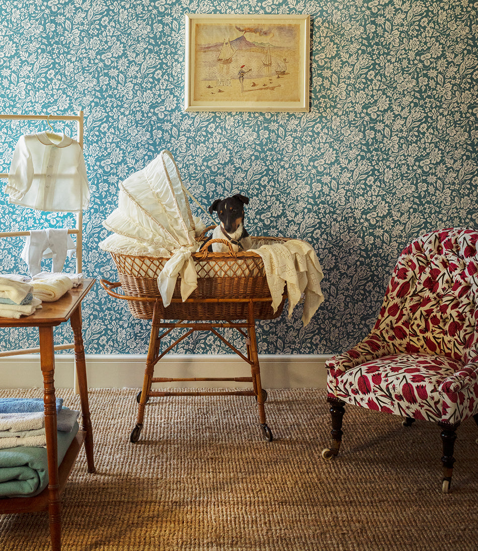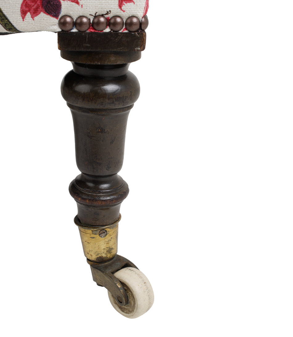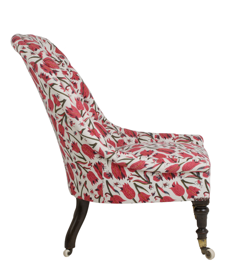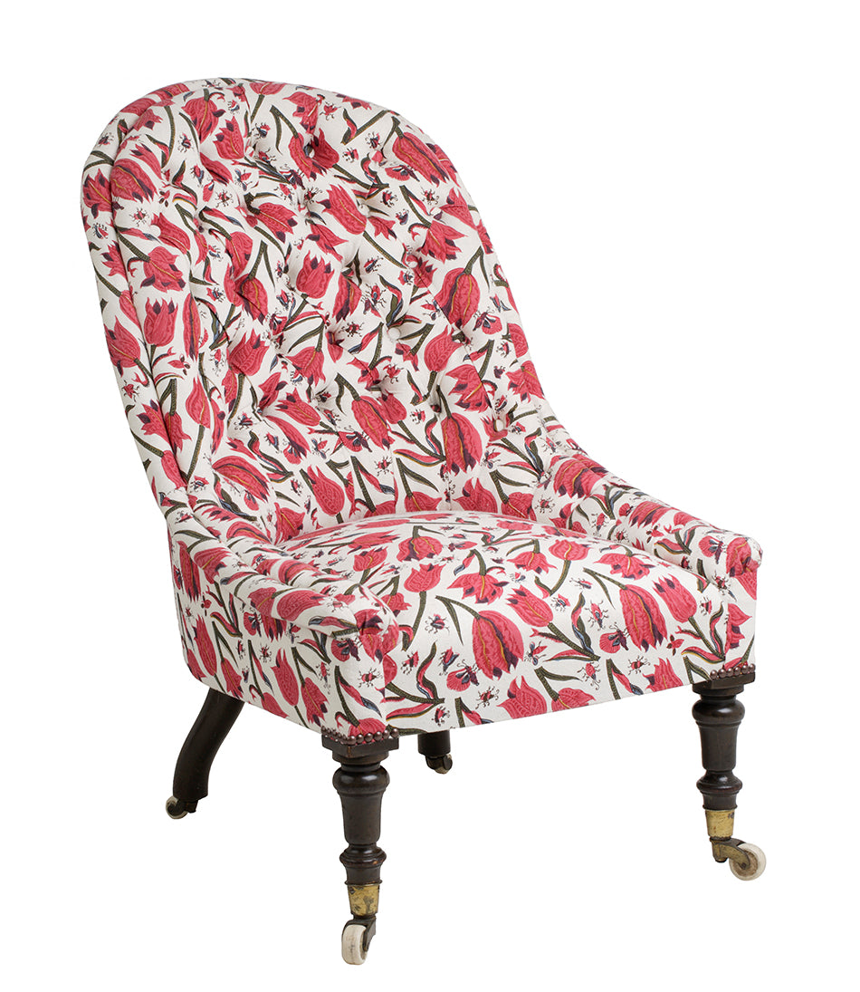 With turned mahogany legs. Upholstered in Soane’s Tulips and Butterflies - Original - Mutka Silk.