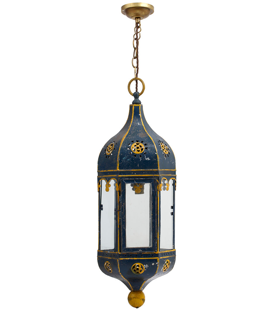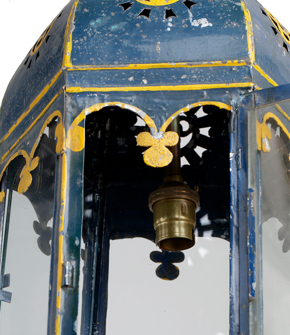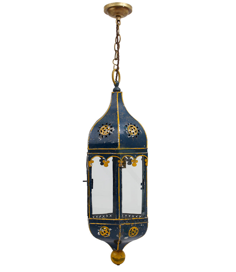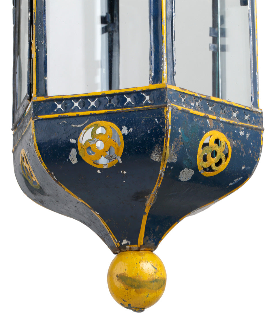 A charming antique hanging lantern with delicate painted blue and yellow detailing. Hanging from an oval link chain and electrified with one bulb holder.