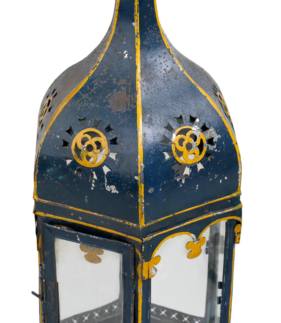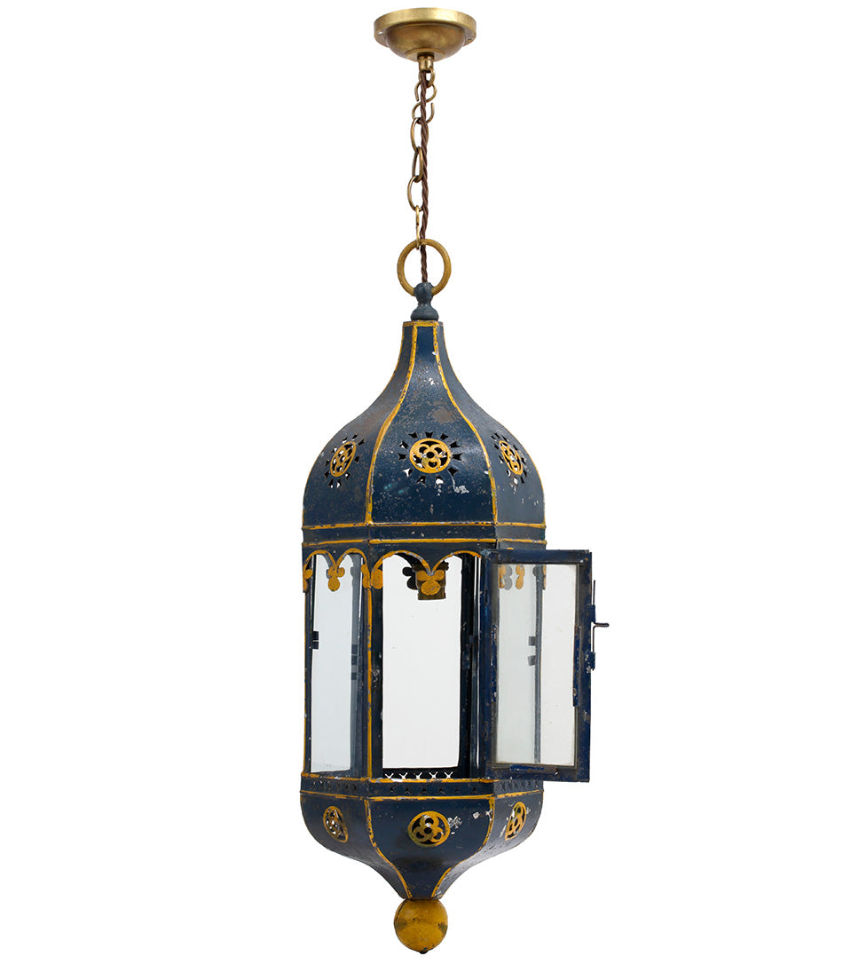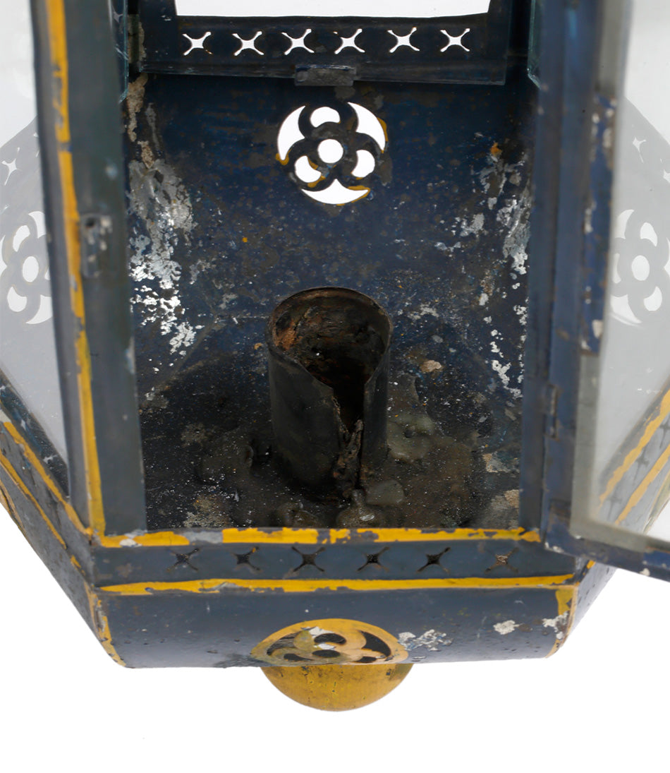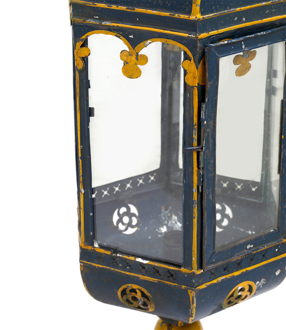 A charming antique hanging lantern with delicate painted blue and yellow detailing. Hanging from an oval link chain and electrified with one bulb holder.