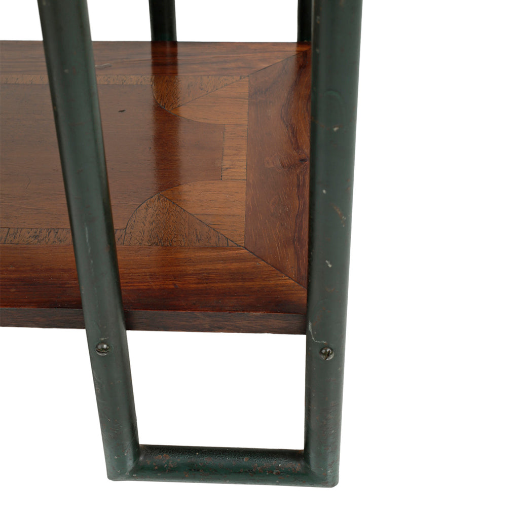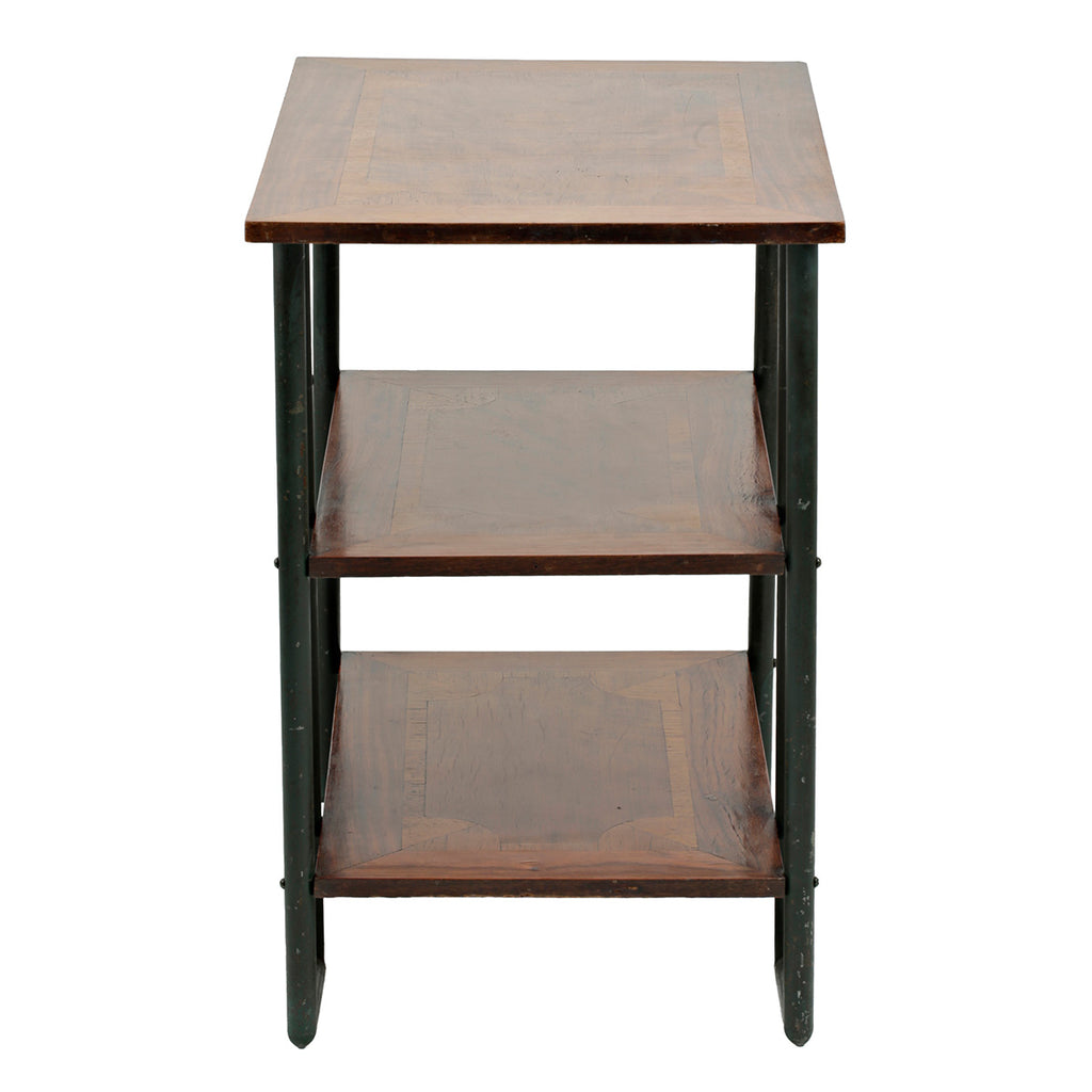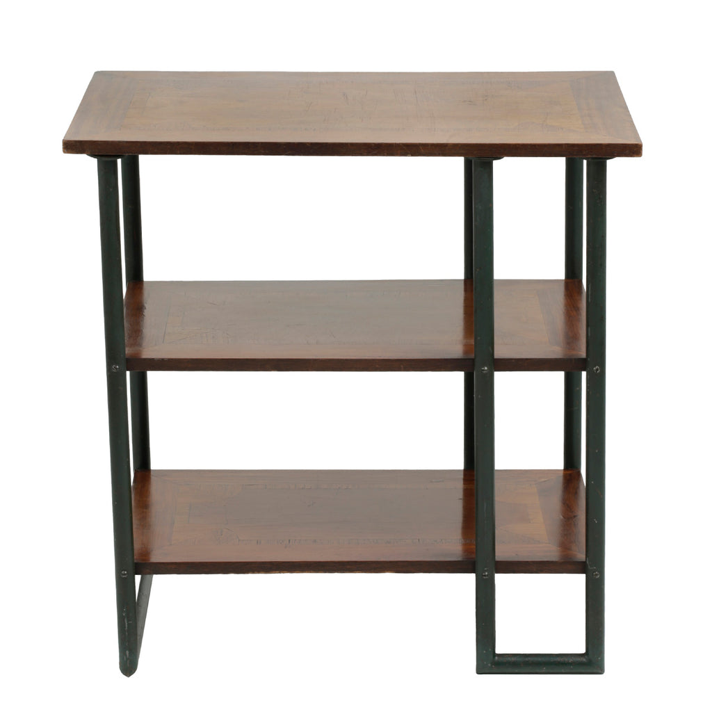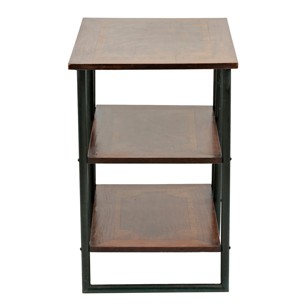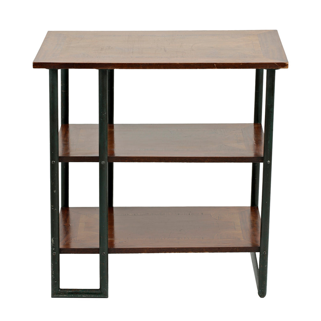 An English 1930s mahogany three-tiered side table with a tubular steel base.