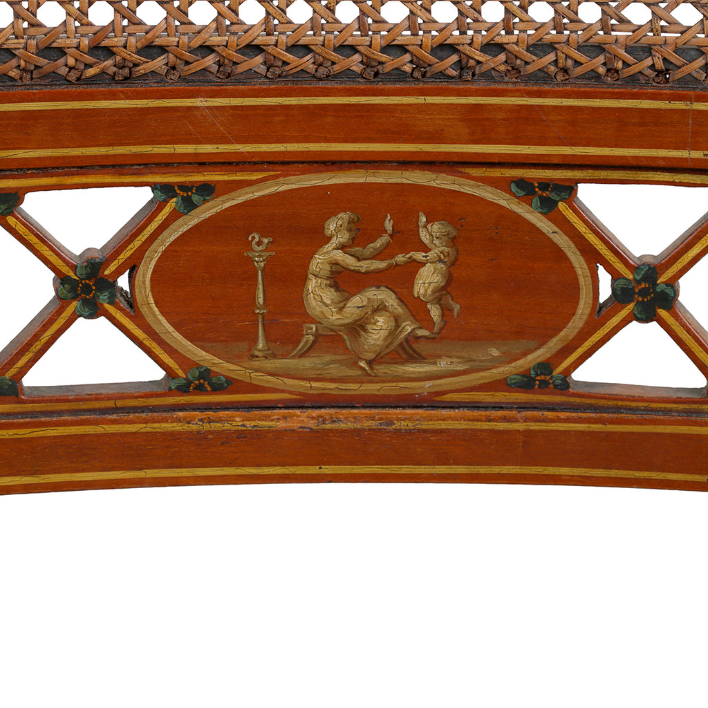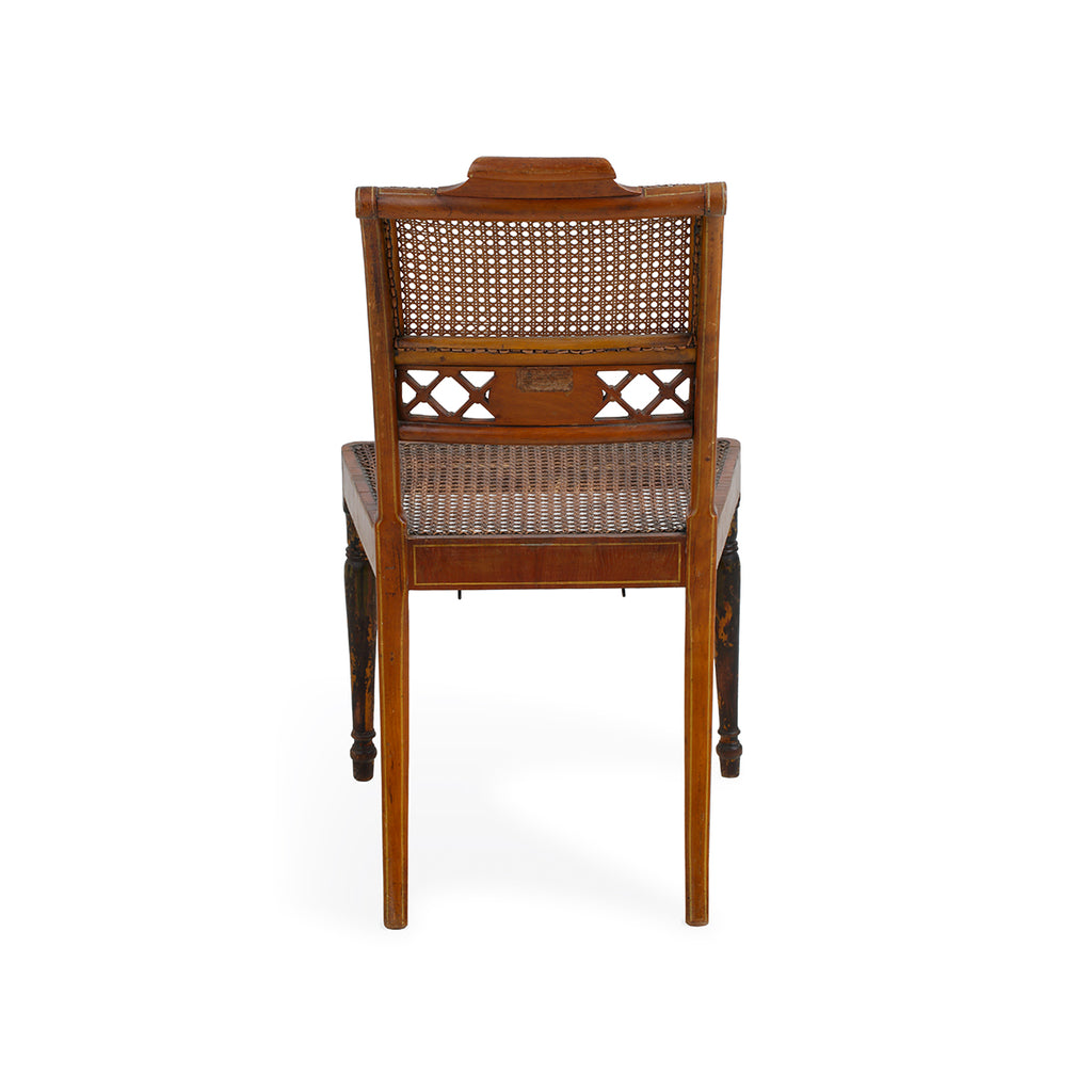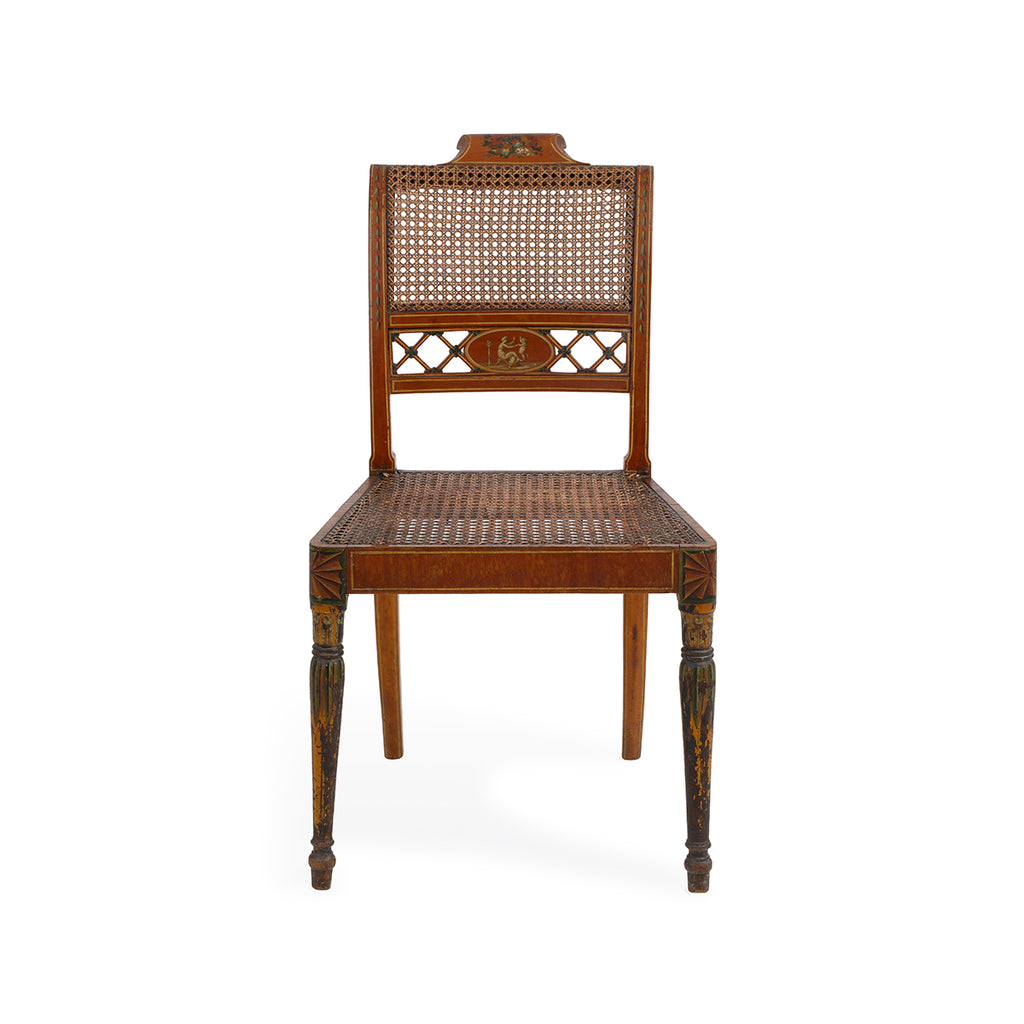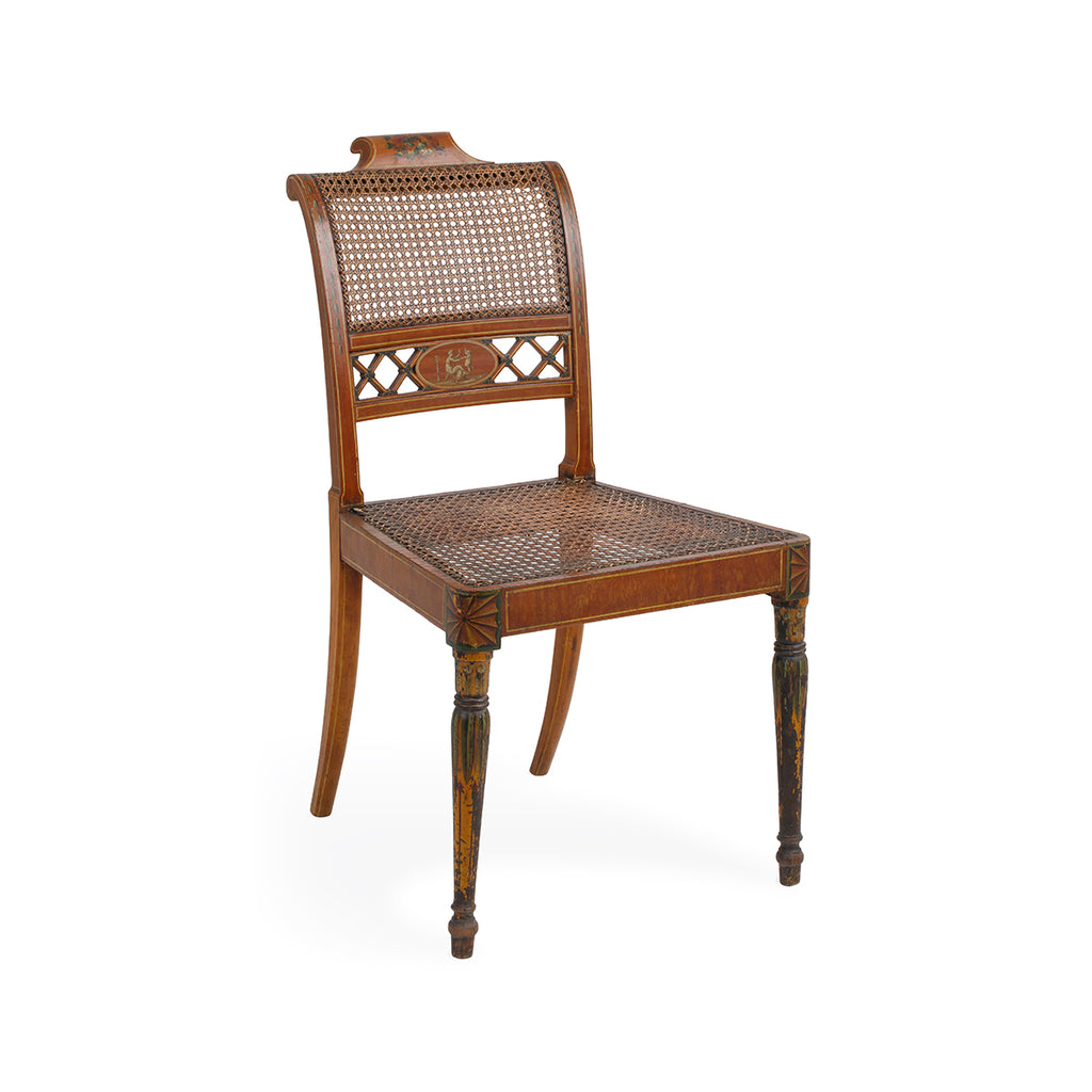A set of four chairs, of beech and satinwood. Made by John Gee, Wardour Street, Soho, London. Stamped with his monogram together with makers stamps. Original painted decoration and recently restored canework.