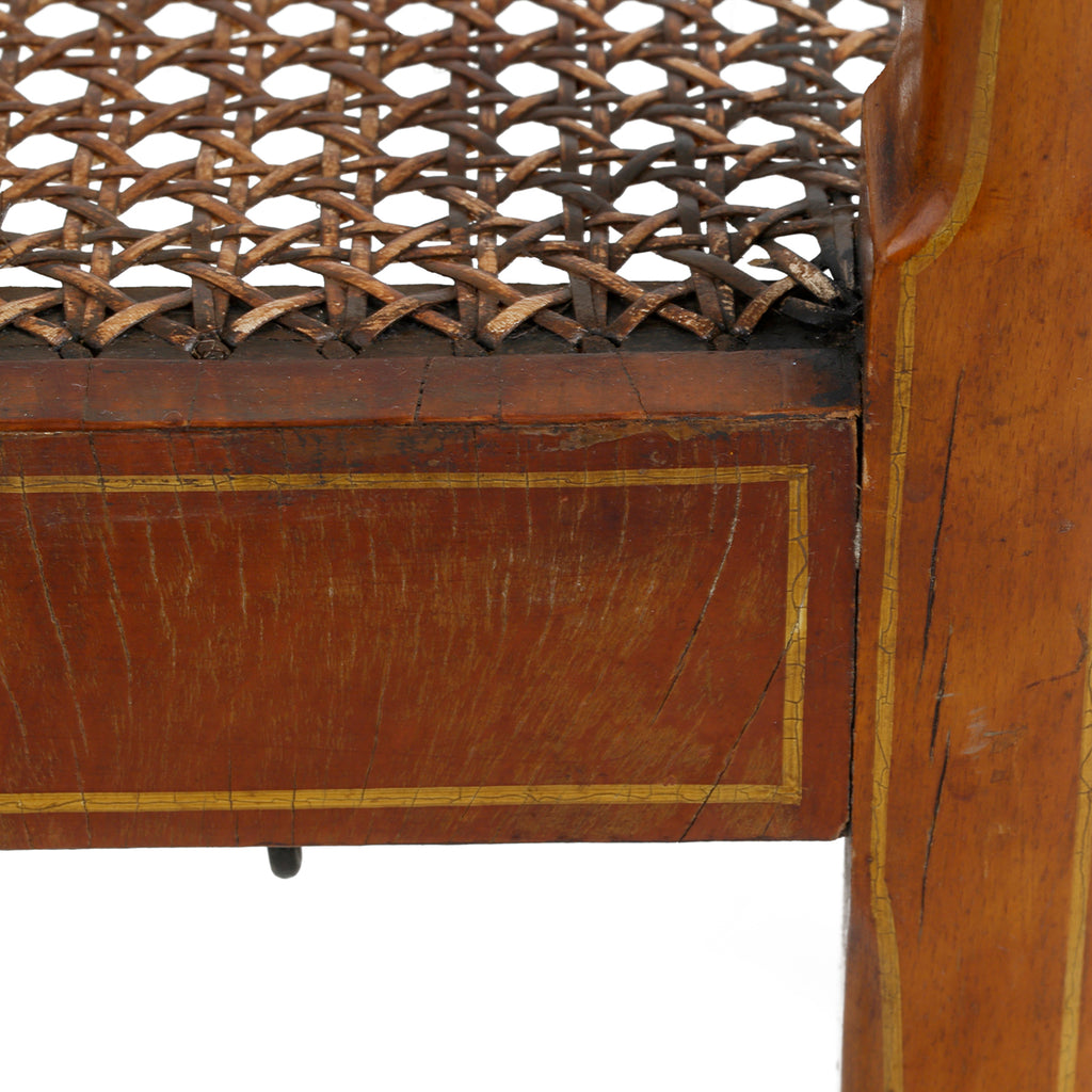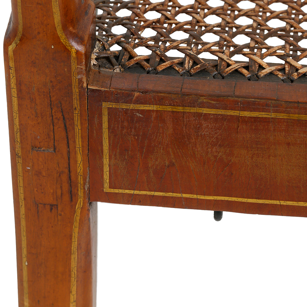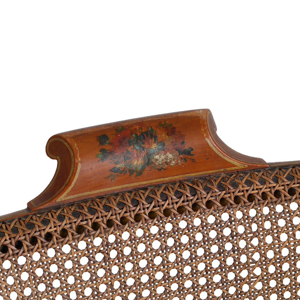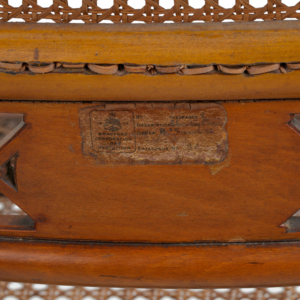 A set of four chairs, of beech and satinwood. Made by John Gee, Wardour Street, Soho, London. Stamped with his monogram together with makers stamps. Original painted decoration and recently restored canework.