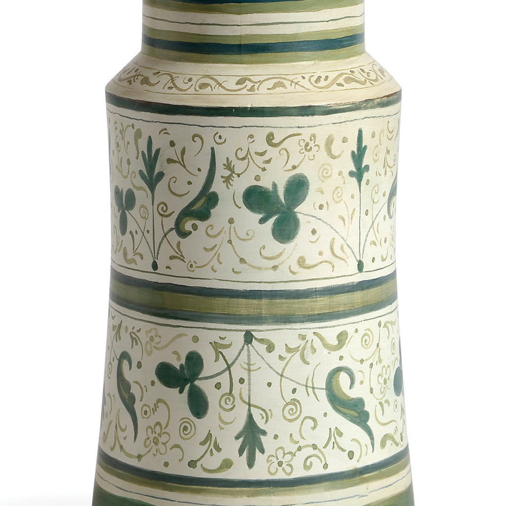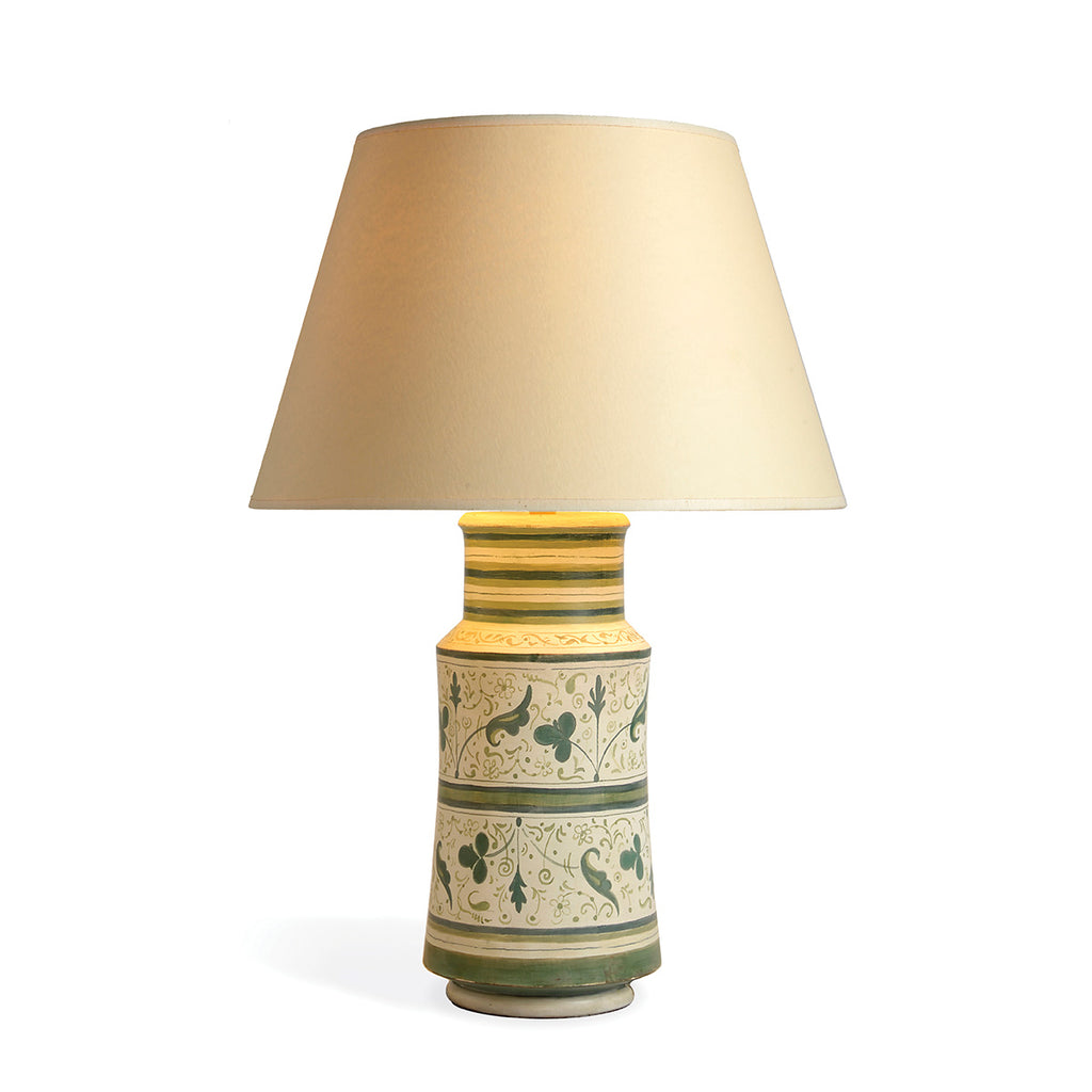 The Apothecary Table Lamp is hand painted by artist Sophie Coryndon in her Sussex studio. The design is inspired by Moorish earthenware jars known as Albarelli. These jars were used to hold ointments, medicines and even gunpowder and became popular in Italian apothecaries in the 15th century. To differentiate their contents the jars were painted with individual designs which Sophie references in the artwork of each lamp.