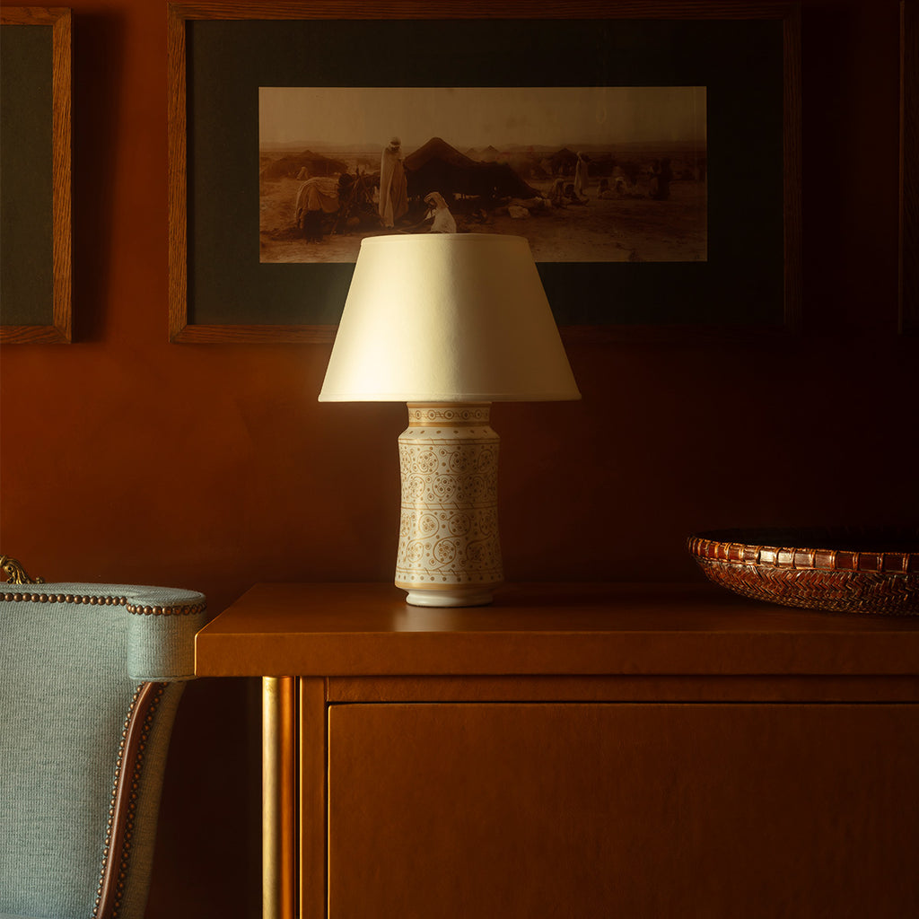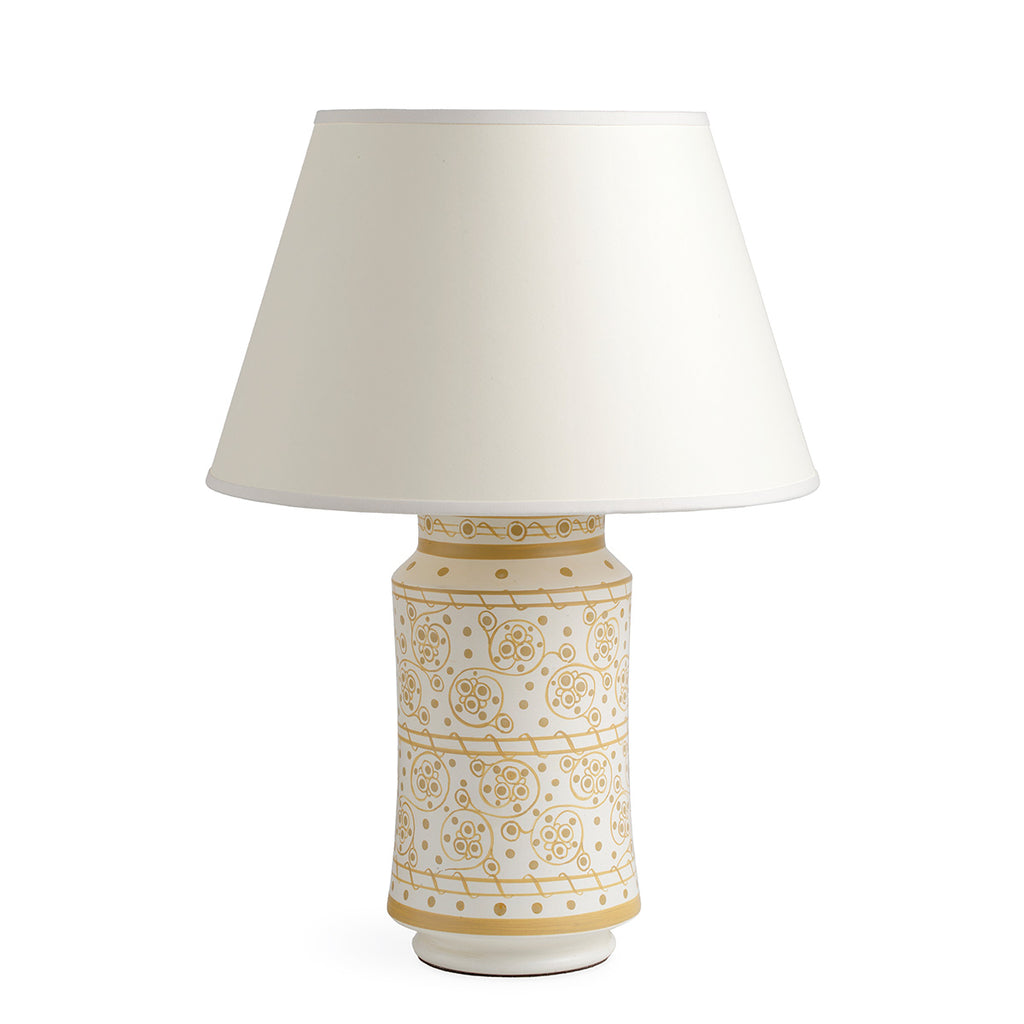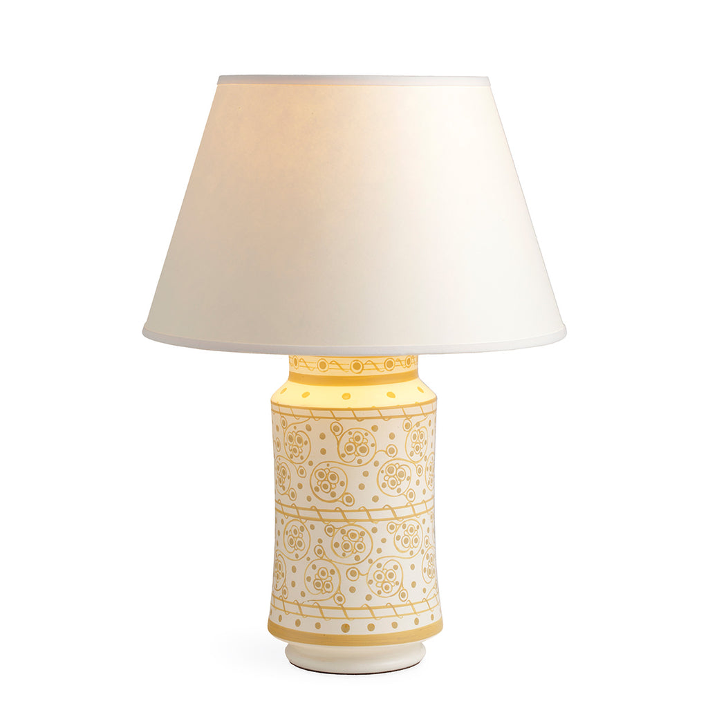 The Apothecary Table Lamp is hand painted by artist Sophie Coryndon in her Sussex studio. The design is inspired by Moorish earthenware jars known as Albarelli. These jars were used to hold ointments, medicines and even gunpowder and became popular in Italian apothecaries in the 15th century. To differentiate their contents the jars were painted with individual designs which Sophie references in the artwork of each lamp.